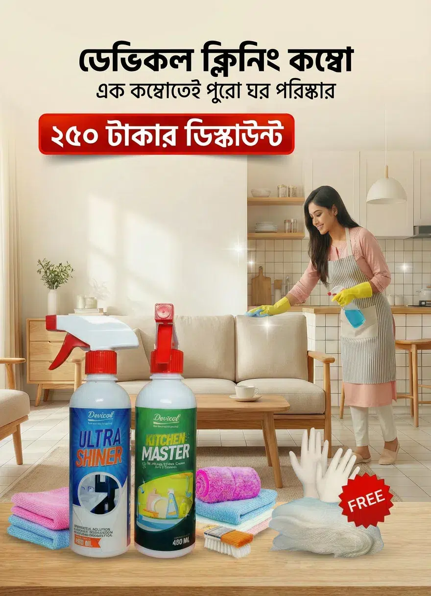 বুদ্ধিমানদের পছন্দ ডেভিকল ক্লিনিং কম্বো প্যাকেজ। এক বান্ডেলে পুরো ঘর পরিষ্কার এবং থাকছে ২৫০ টাকার ডিস্কাউন্ট অফার।